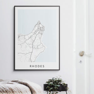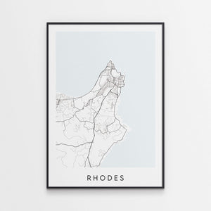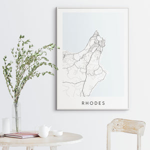 Rhodes map print in our minimal mono style. If Rhodes holds a special place in your heart, why not have a constant reminder of it on your wall?